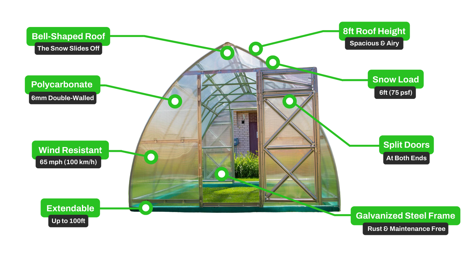 With end-to-end airflow, a roomy interior, and a distinctive 8-foot high ceiling, you and your plants will stay comfortable and cool all day long.